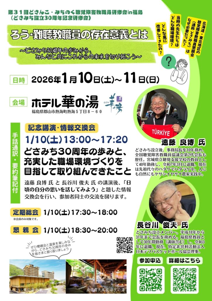 - 2025年12月04日・・・ 第31回どさんこ・みちのく聴覚障害教職員研修会in福島(どさみち設立30周年記念研修会)のお知らせ