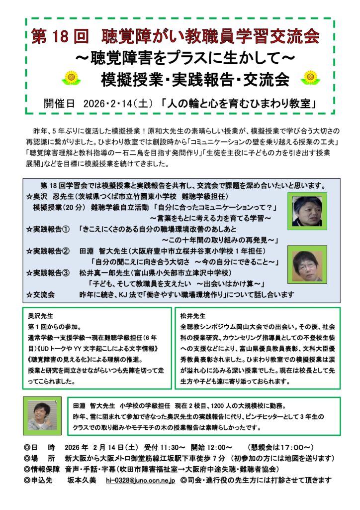 - 2025年12月04日・・・ 第31回どさんこ・みちのく聴覚障害教職員研修会in福島(どさみち設立30周年記念研修会)のお知らせ